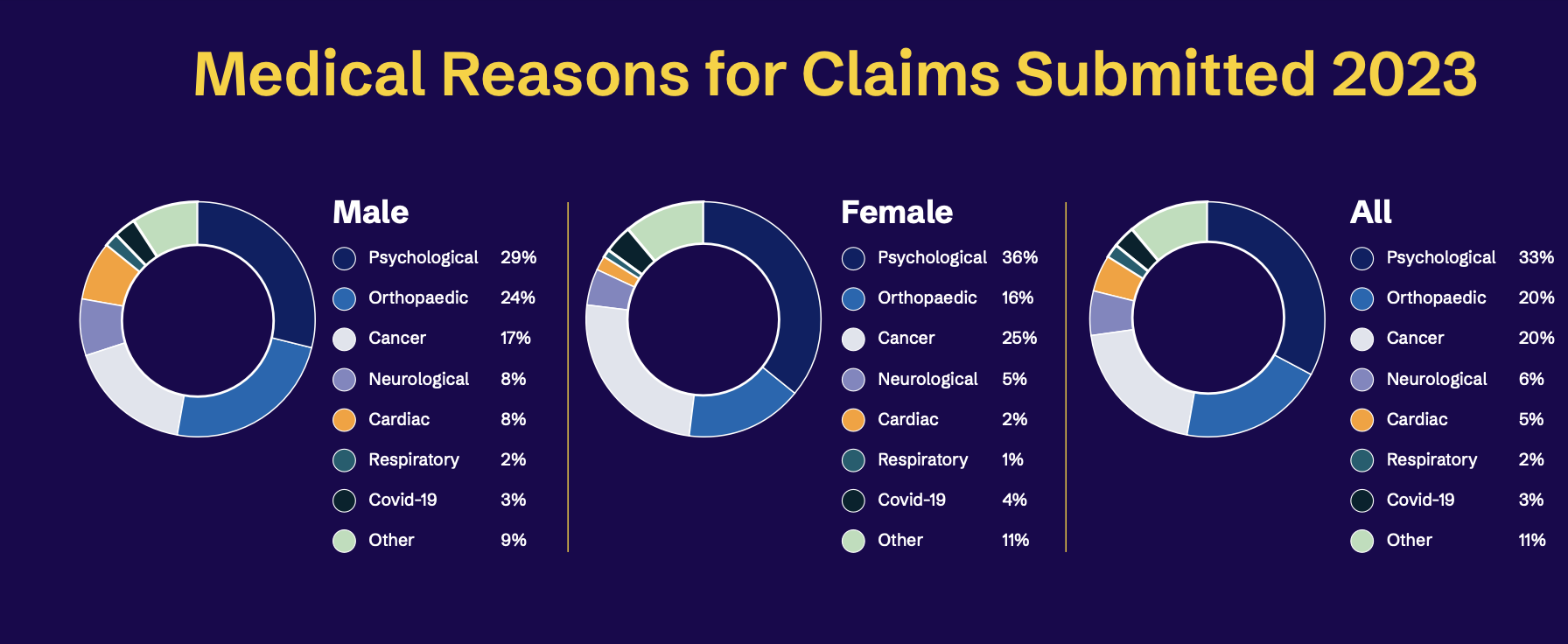 Mental health issues were the top reason for claims, making up 33% of all claims. This was even higher at 36% for women, while for men, it was 29%. Other common reasons included orthopaedic problems (like back or joint issues) at 20% and cancer, also at 20%.