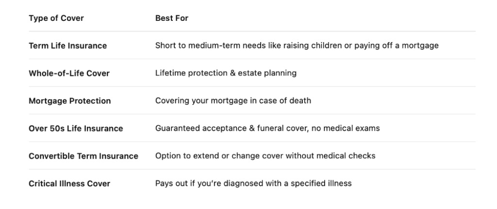 - Dual Life Cover – Covers both individuals separately. It pays out on the death of each person, offering two separate payouts.