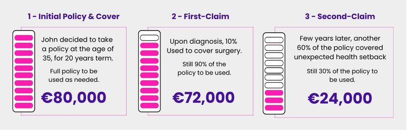 • Policy: Single life Multi-Claim Protection Cover for €80,000 over a 20-year term.